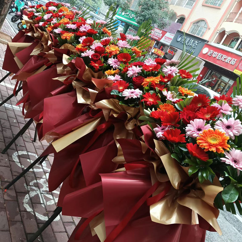 花材: 26朵各色扶郎花、玫瑰花混搭,搭配栀子叶、散尾葵混搭。红色/金色双面纸束扎,红色花结。