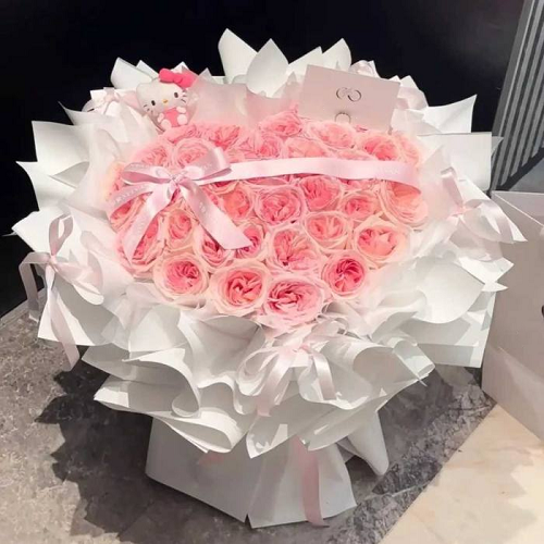 【温柔相伴】精选33朵粉荔枝玫瑰,心形造型,1只kitty猫(款式随机),表面粉色丝带蝴蝶结装饰。