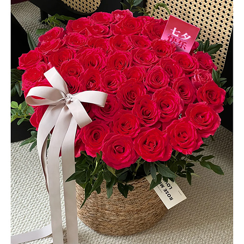 【幸福童话】52朵红玫瑰心形造型,花面2条缎带蝴蝶结装饰。