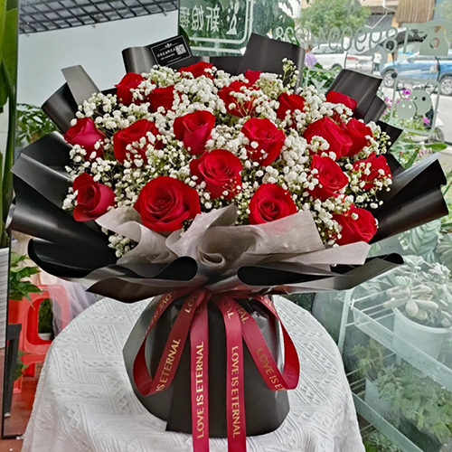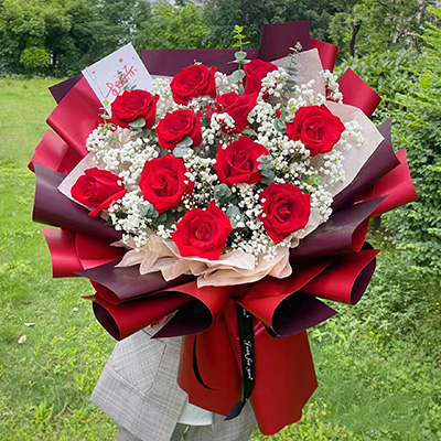 【幸福就在你身边】11朵精品红玫瑰,搭配满天星、尤加利叶间插。