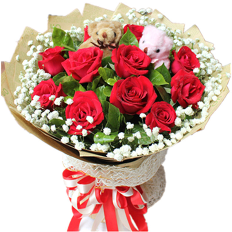 【深情挚爱】11支精品红玫瑰+2只可爱小熊,搭配适量白色满天星、栀子叶。