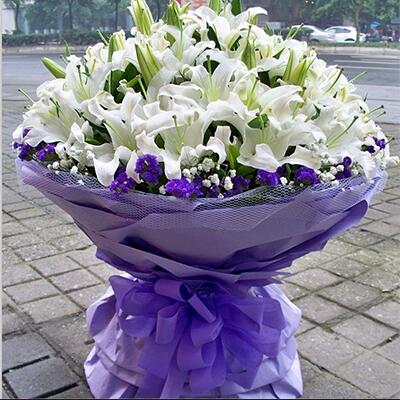 【如梦如烟】66朵白色香水百合,绿叶丰满间插,勿忘我、满天星围边点缀。