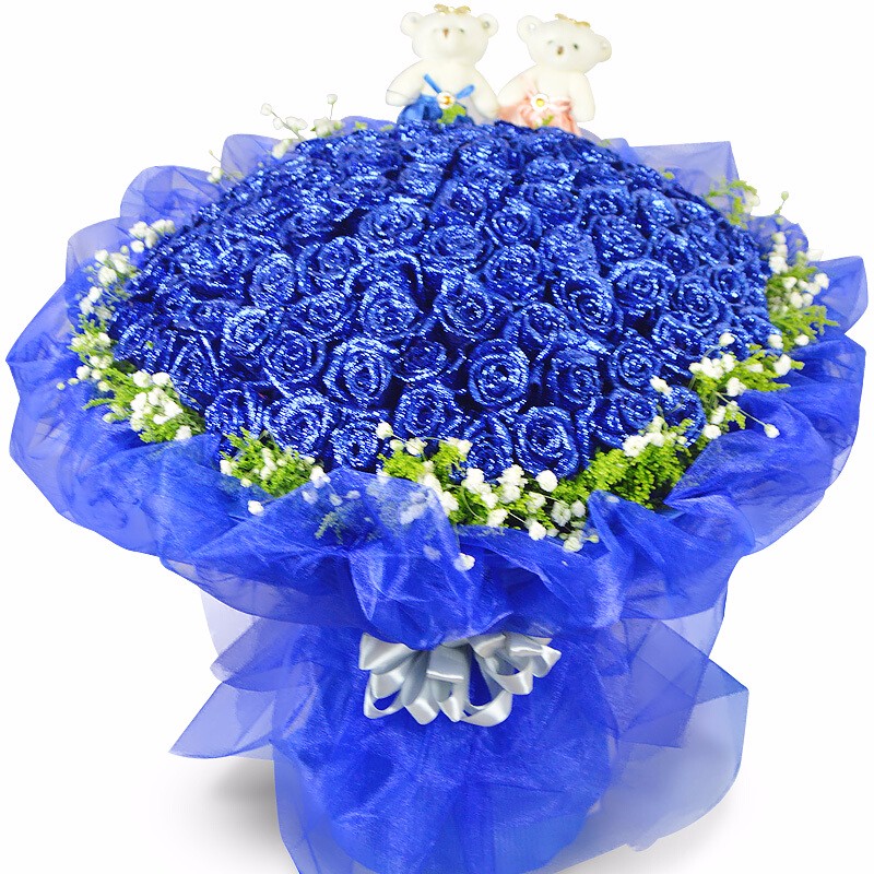 【萧瑟轻音】66朵顶级蓝玫瑰,2只可爱小熊,满天星、黄莺环绕。