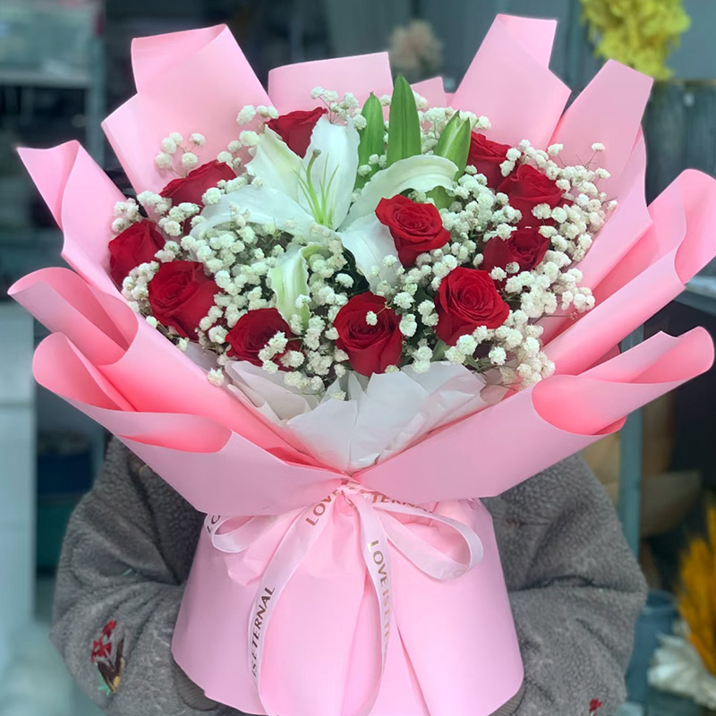 花材: 精选11朵红玫瑰,1支多头白色香水百合,搭配尤加利叶、满天星丰满装饰。