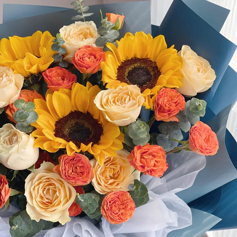 花 材:3支向日葵,8朵香槟色玫瑰,搭配5支橙色多头小玫瑰(断货则用5支洋桔梗代替),尤加利叶间插装饰。