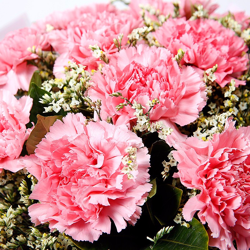 花 材:11支精品粉康乃馨,搭配适量水晶草、绿叶。