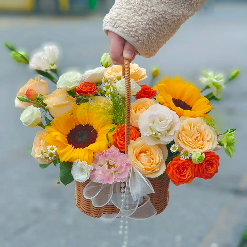 花材: 精选8枝香槟玫瑰,2枝向日葵,1朵粉色康乃馨,3支多头橙色泡泡,4支浅色多头洋桔梗,搭配洋甘菊、喷泉草、尤加利叶装饰。