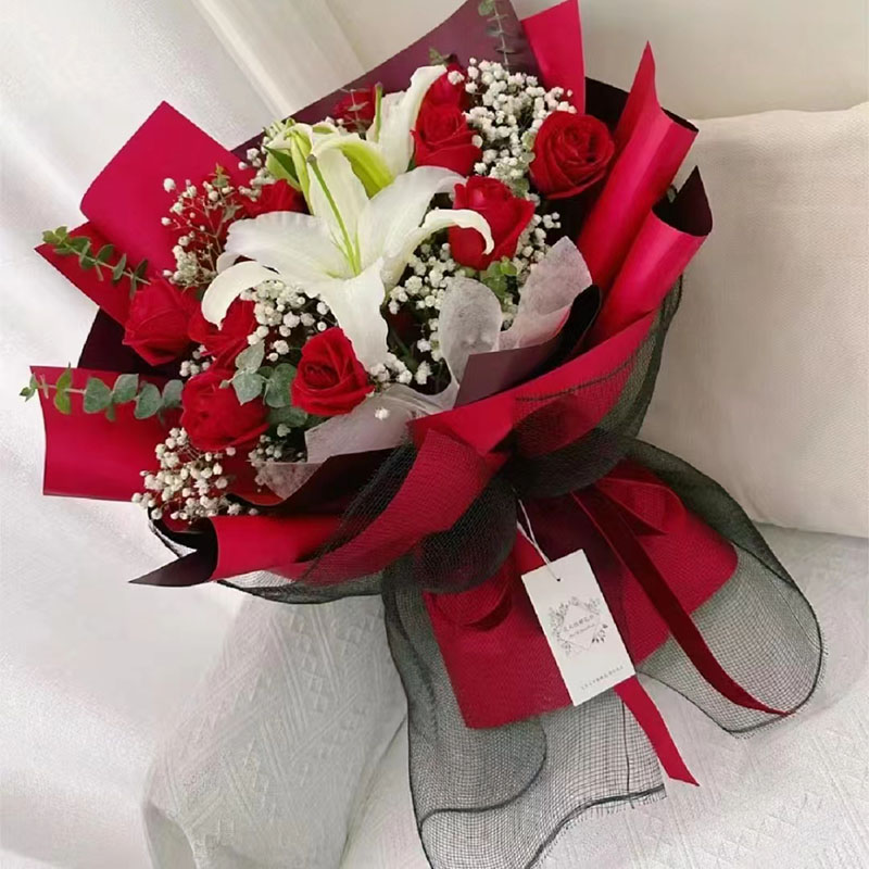 花 材:11朵红玫瑰,1支白色多头香水百合,搭配满天星、尤加利叶装饰。