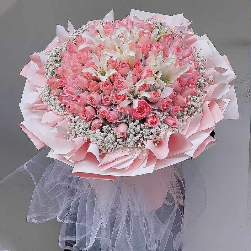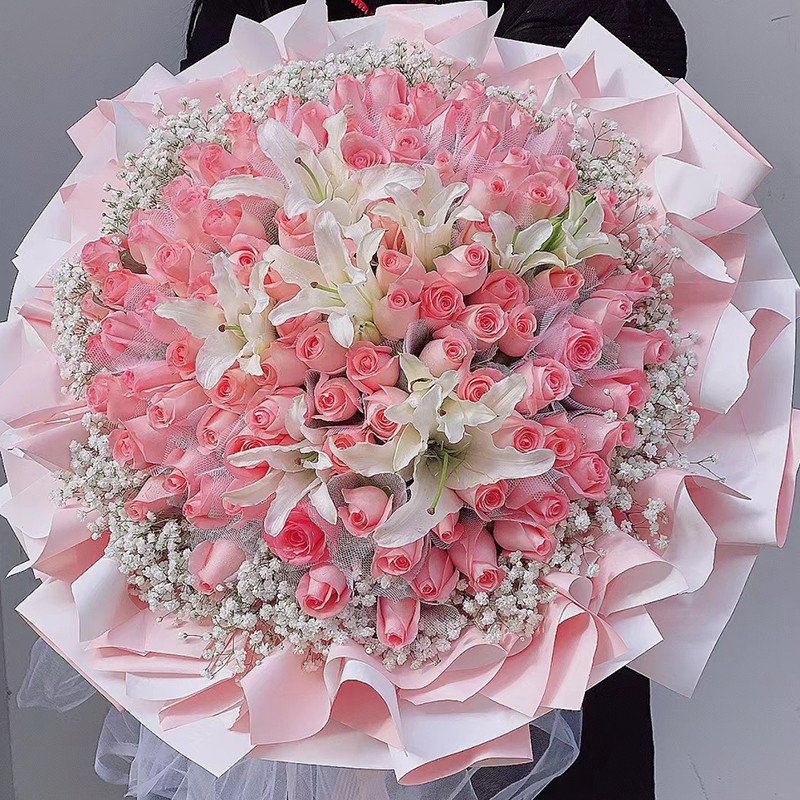 粉面佳人 - 99朵戴安娜粉玫瑰,4枝多头白色香水百合,满天星环绕装饰。