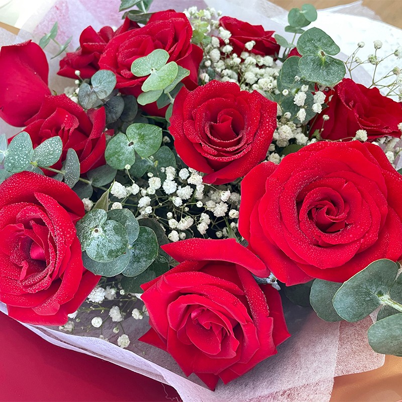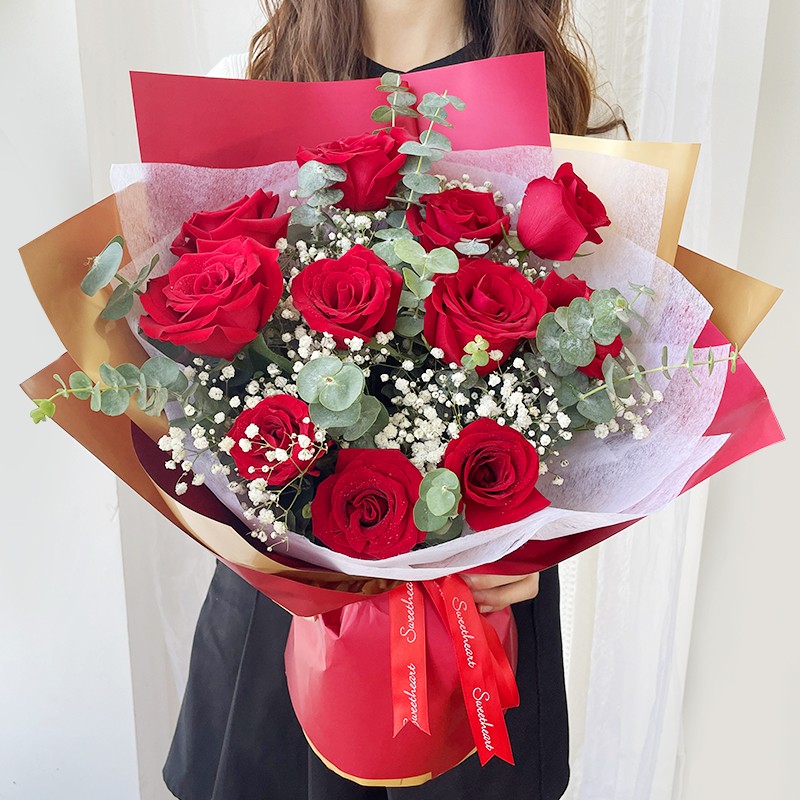 • 花材11枝卡罗拉红玫瑰、搭配白色满天星、尤加利点缀。