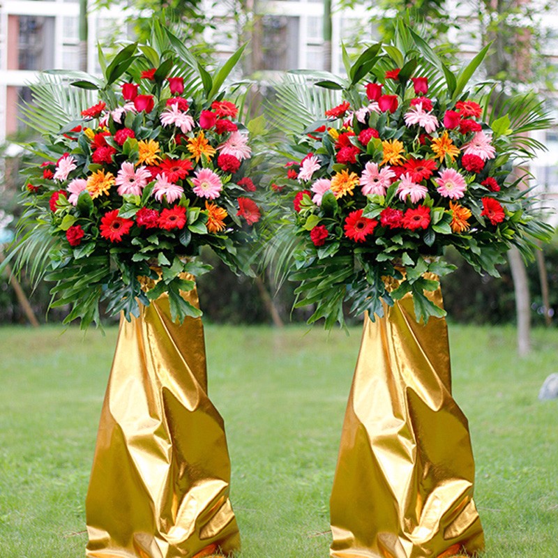 花 材:各色弗朗,康乃馨,玫瑰混搭共36只,搭配适量富贵竹、散尾葵。一层花架一个,金箔纸包裹。