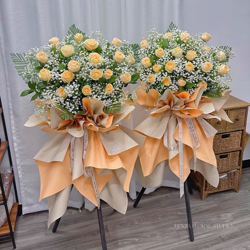 花 材:19朵香槟玫瑰,搭配大量满天星、尤加利叶、散尾葵装饰。 香槟色包装纸韩式花束包装,三脚架花篮。