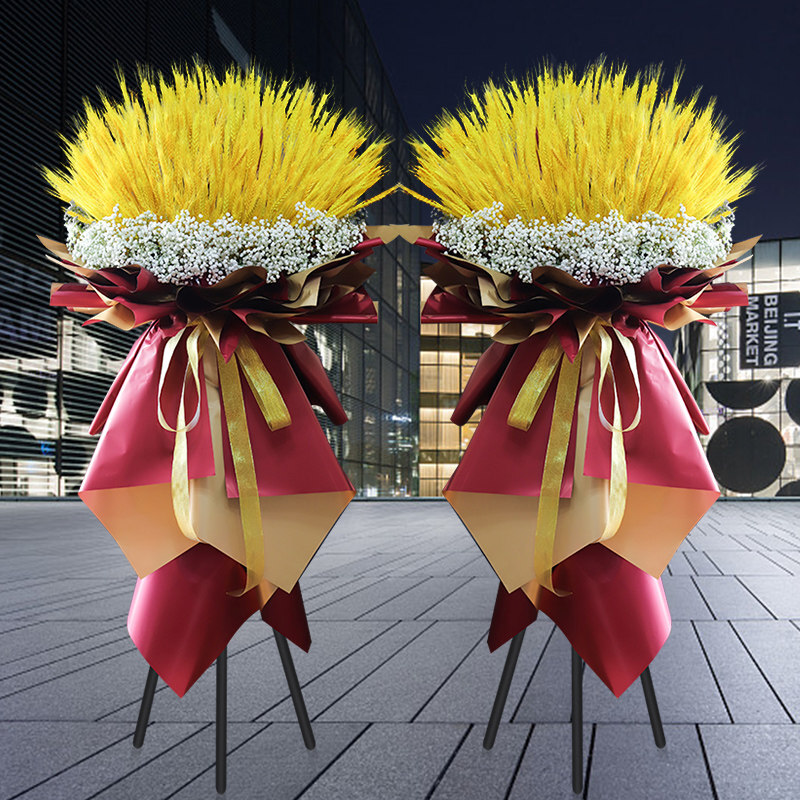 花材: 大麦扇形造型,满天星底部外围环绕,红色、金色双面纸多层包扎,香槟色花结。