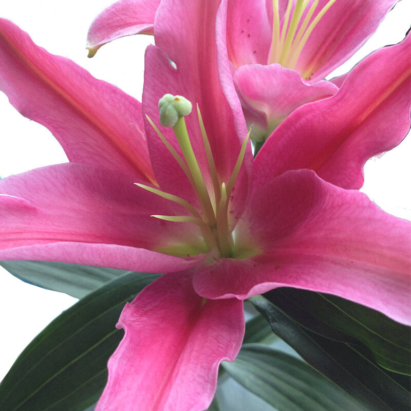 花 材:三色太阳花两扎,三朵粉色香水百合,栀子叶、散尾葵适量,粉丝棉纸包裹,两层花架1个。