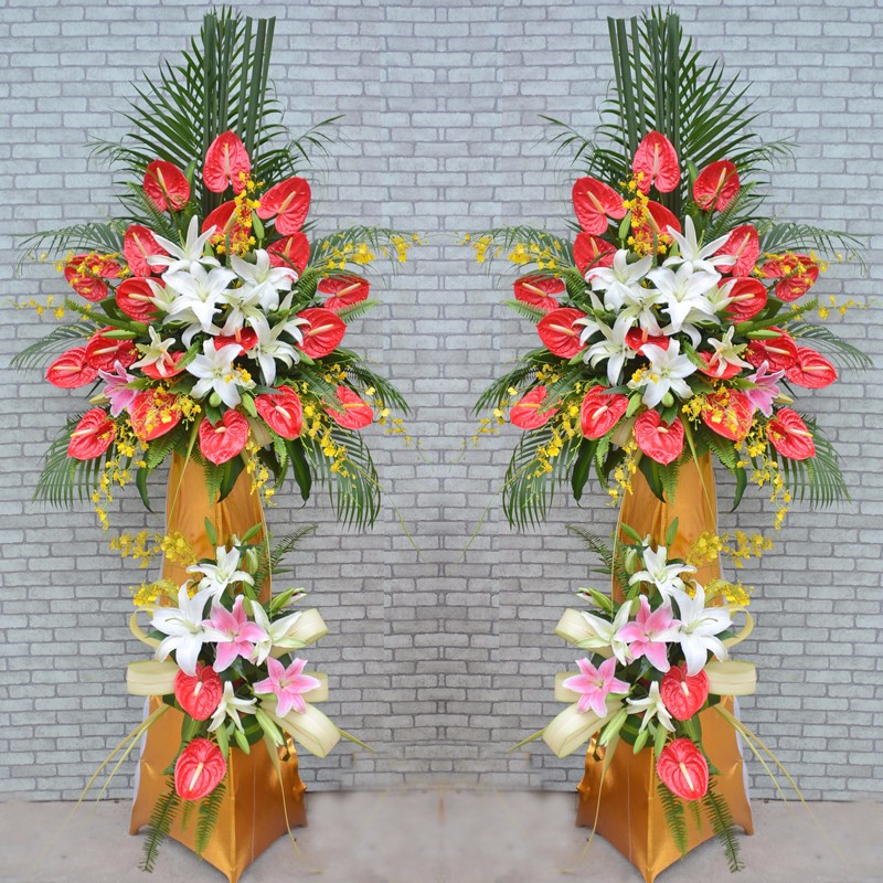花材: 红掌2扎,香水百合2扎,散尾葵适量,两层花架,金箔纸包裹。