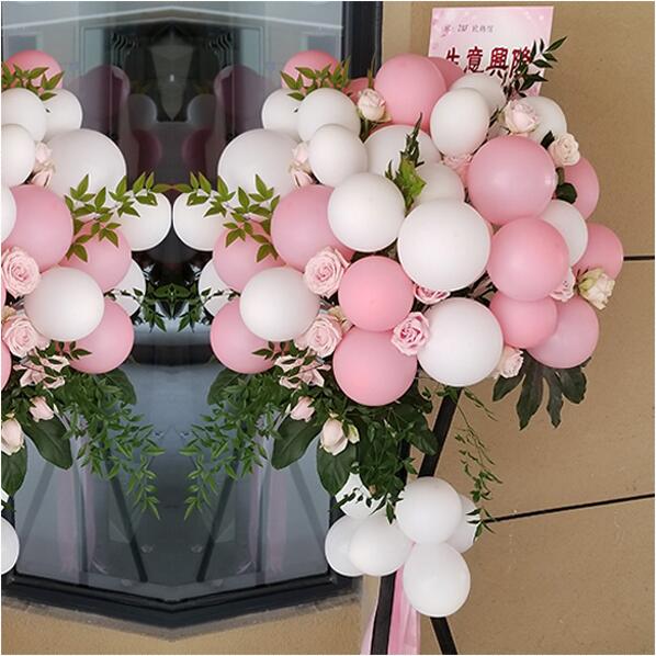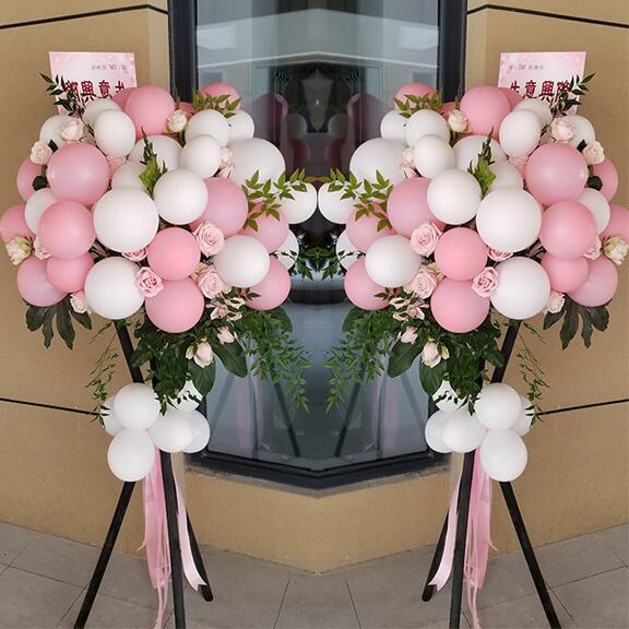 花 材:16个粉气球,22个白气球,戴安娜粉玫瑰间插,龟背叶等绿叶搭配
