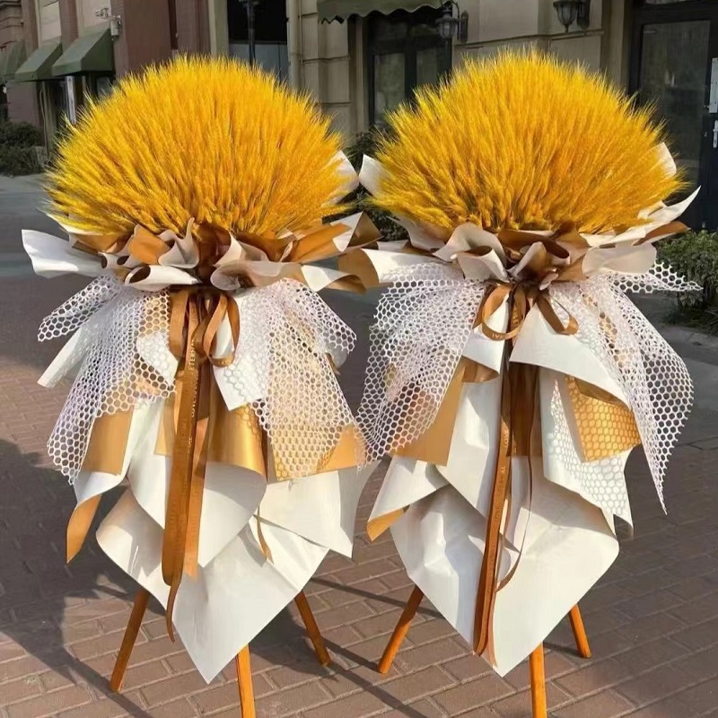 花材: 高档时尚仿真大麦、大麦,金色/白色双色纸韩式包装,白色网格装饰,金咖色缎带花结。