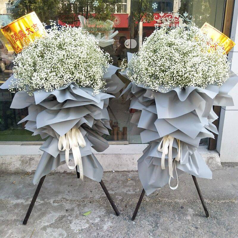 花 材:白色满天星,银灰色雾面纸韩式束扎,香槟色花结。
