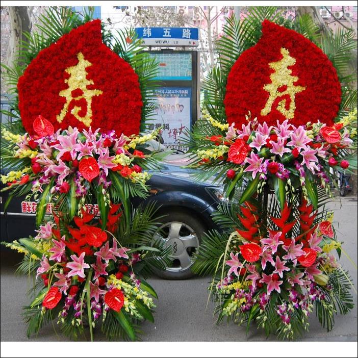 花 材:红色康乃馨做背景,香槟色康乃馨拼成“寿”字,最外层用栀子叶和散尾葵环绕,造型呈寿桃状。2层底座都用红玫瑰、百合,洋兰,红掌,巴西叶、剑叶,搭配大量散尾葵。