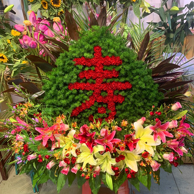 花 材:绿叶做背景,红色康乃馨拼成“寿”字,最外层用红竹叶、散尾葵环绕,造型呈寿桃状。底座用百合、玫瑰、多头小玫瑰等配草。