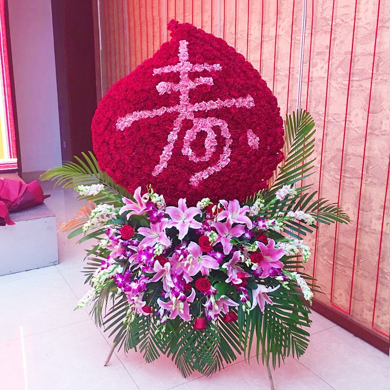 花 材: 球形寿桃造型,红色康乃馨打底,粉色康乃馨拼成“寿”字,底座用红玫瑰、百合、洋兰、金鱼草,搭配大量绿叶、散尾葵。
