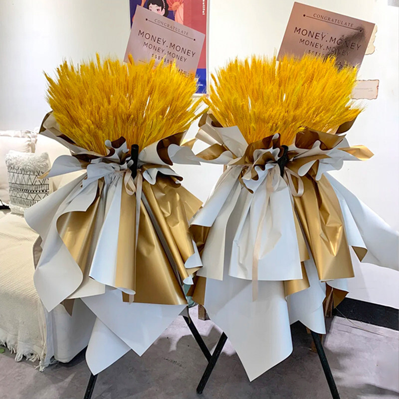 花 材:500支大麦,金色白色双面纸多层花束包扎,香槟色花结。