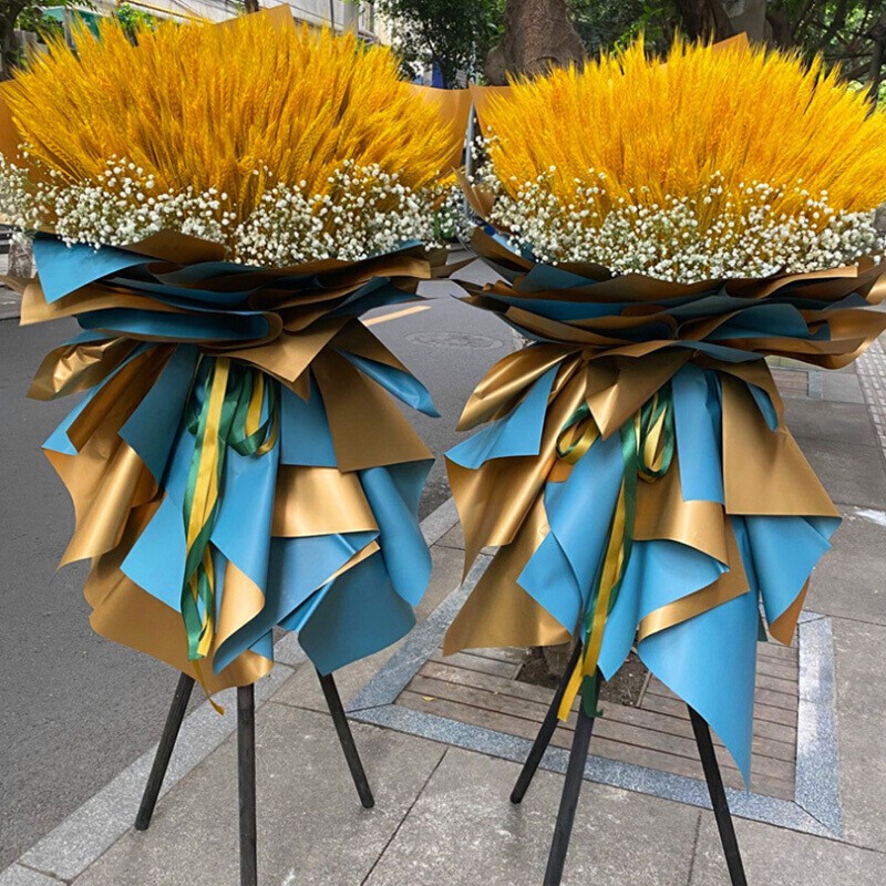花材: 大麦扇形造型,满天星底部外围环绕,蓝色、金色双色纸多层包扎,金色花结。