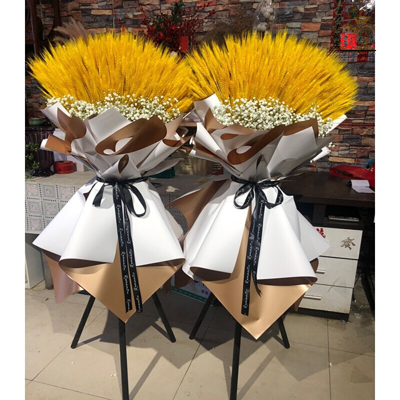 花材: 大麦扇形造型,满天星底部外围环绕,银色、金色双面纸多层包扎,黑色英文缎带花结。