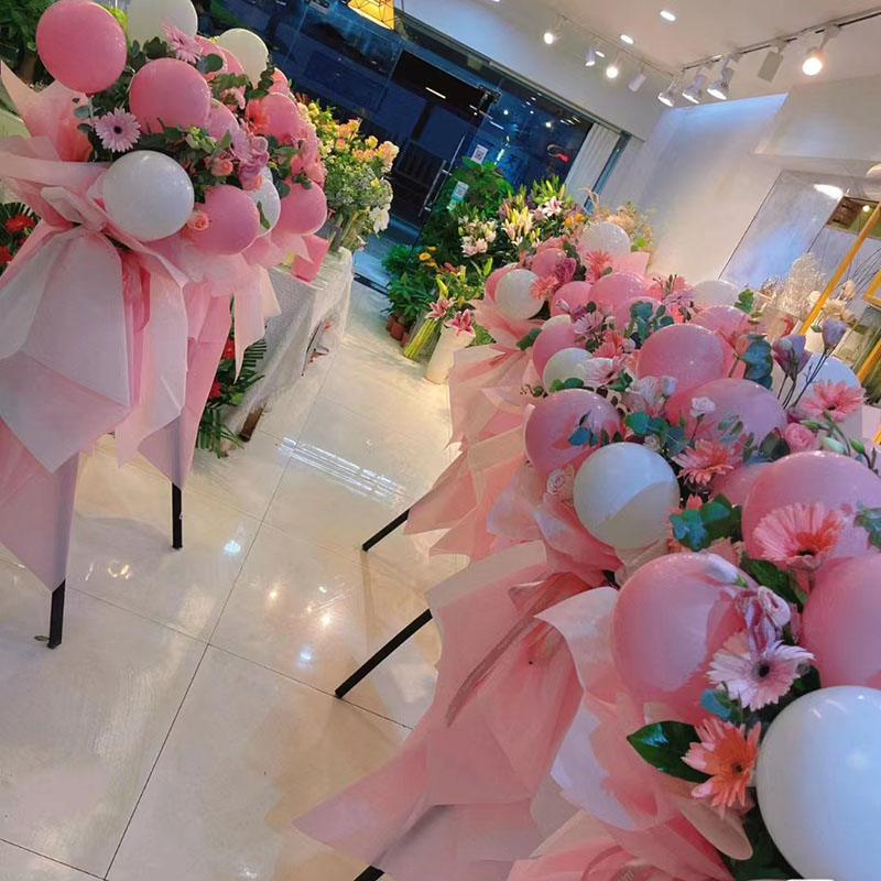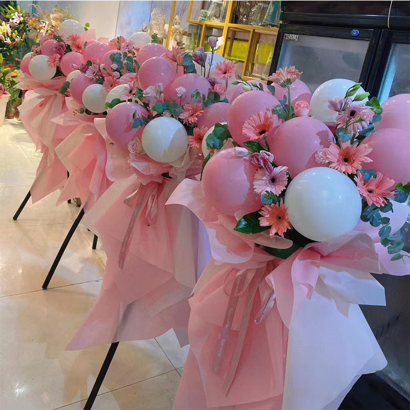 花 材:8个粉色、白色气球,10朵粉色扶郎花,搭配洋桔梗、尤加利叶。粉色亮面纸包装,同色系花结。