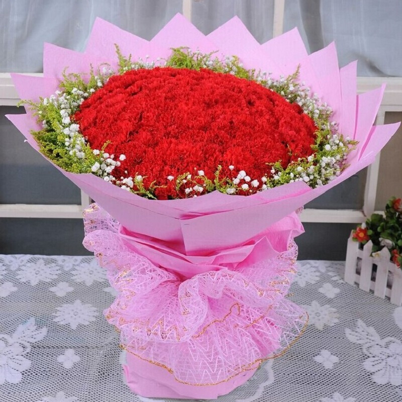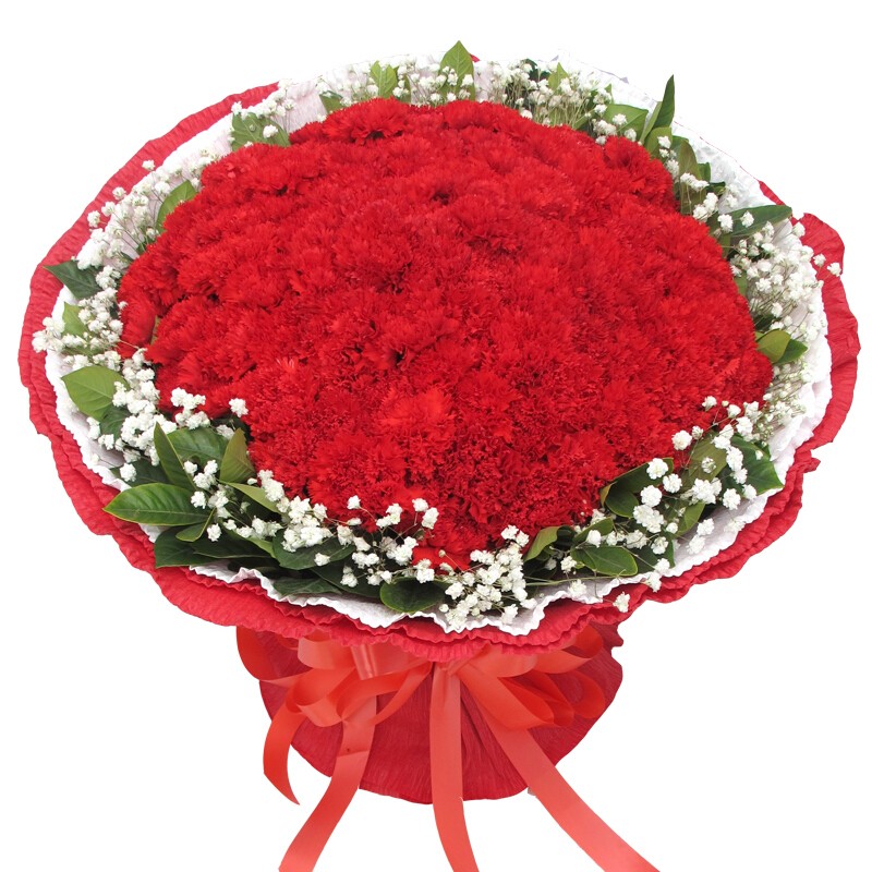 【上善若水】99朵红色康乃馨,搭配白色满天星外围环绕。