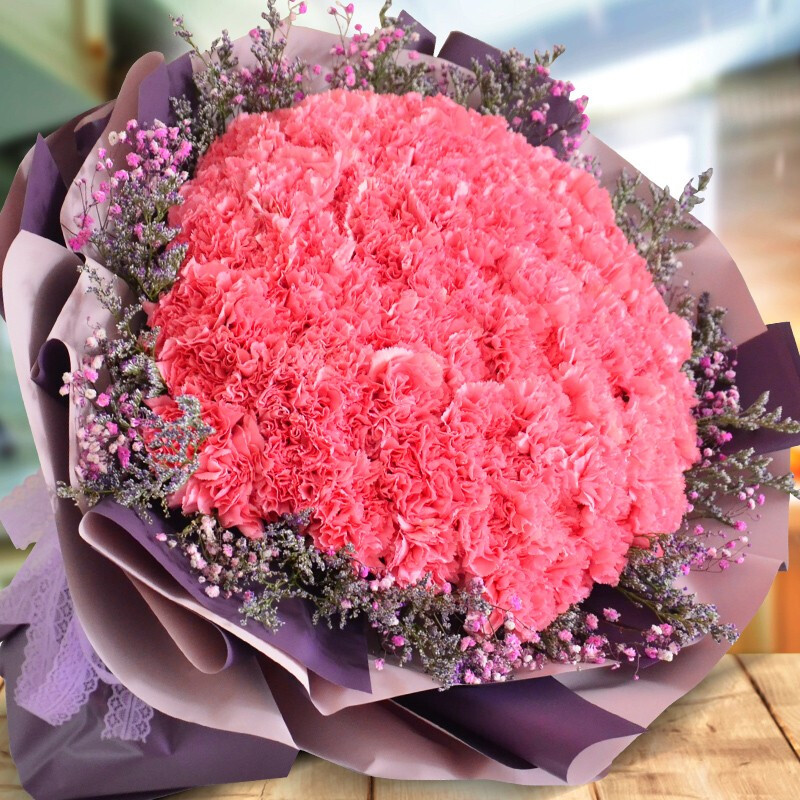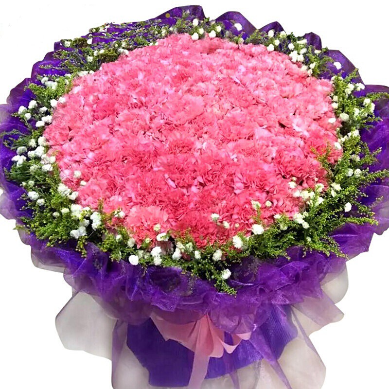 【远山浅蓝】99朵粉色康乃馨,搭配满天星、黄莺草外围环绕。