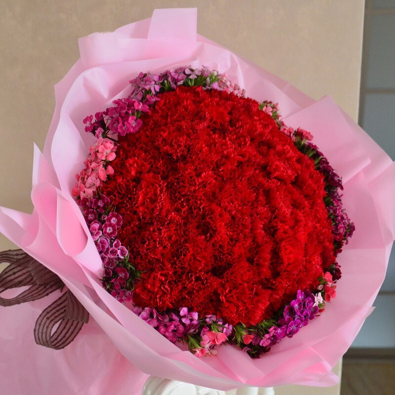 【我心依旧】99朵红色康乃馨,石竹梅外围环绕。