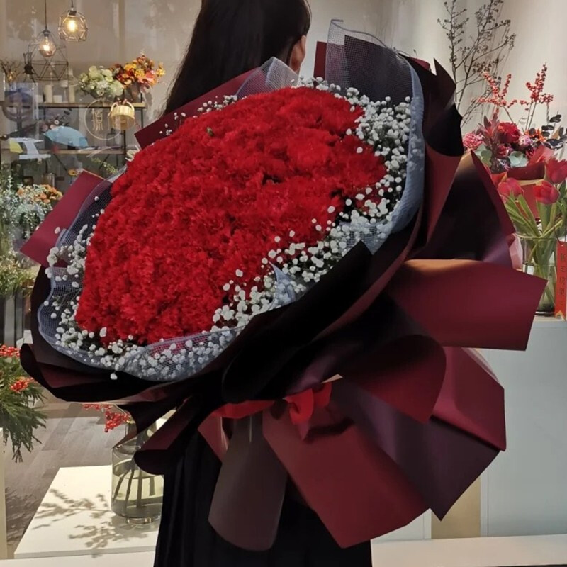 【花开似锦】99朵红色康乃馨,白色满天星、栀子叶外围环绕。
