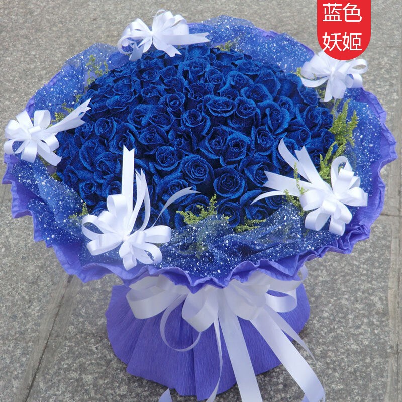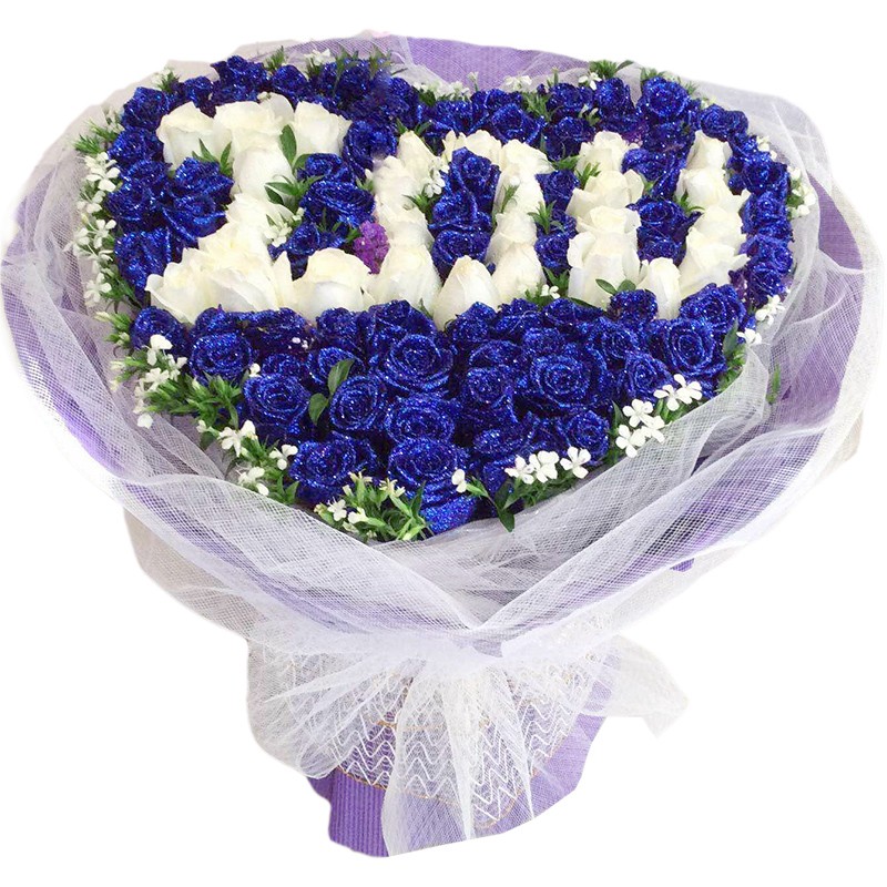 【浓情蜜蜜】156朵极品蓝色妖姬、红玫瑰、白玫瑰、香槟玫瑰、粉玫瑰合成,四周满天星点缀。