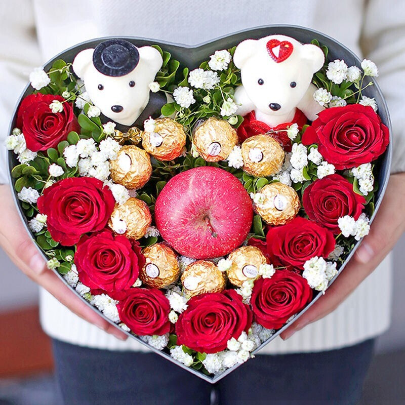 【甜蜜圣诞】精选9朵红玫瑰,8粒费列罗巧克力,1颗红苹果,2只小熊,搭配满天星、栀子叶装饰。