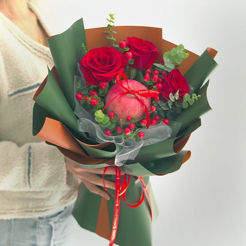 【美梦圆满】3朵红玫瑰,1颗苹果,搭配尤加利叶、红豆装饰。