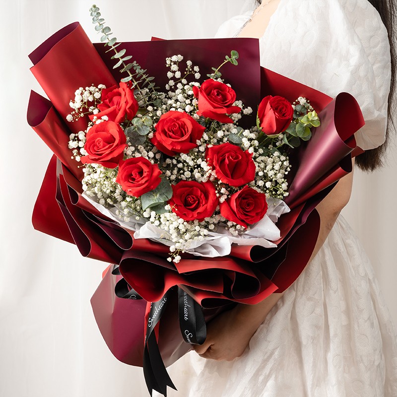 【爱情火焰】精选9支红玫瑰,搭配满天星、尤加利叶丰满间插。
