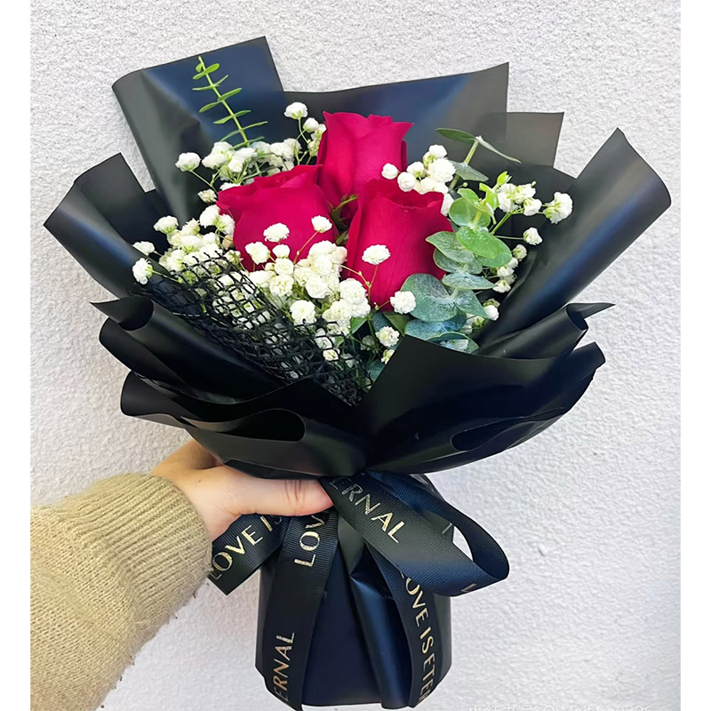 【甜蜜可爱】精选3朵红玫瑰,搭配满天星、尤加利叶装饰。