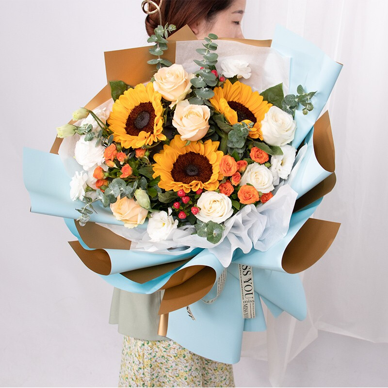 【美好的明天】3朵向日葵,9朵(香槟玫瑰、白玫瑰)混搭,搭配3支多头橙色小玫瑰,洋桔梗,尤加利叶装饰。