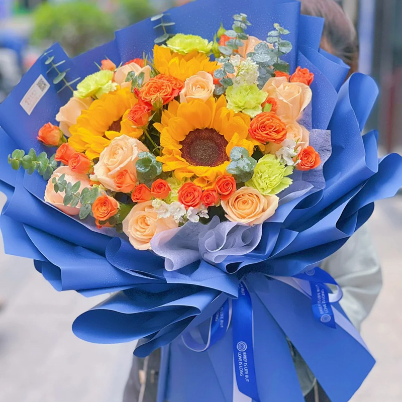 【清新微风】3支向日葵,11朵香槟玫瑰,搭配4支洋桔梗,6支多头橙色泡泡,尤加利叶装饰。