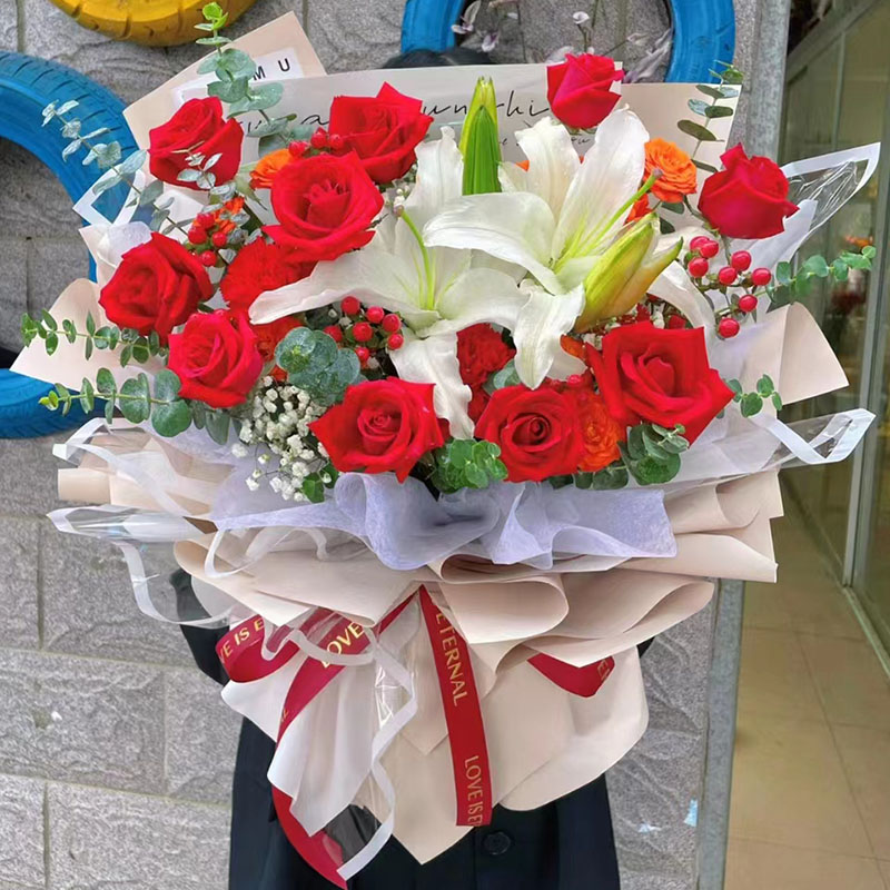 【不负韶华】红玫瑰、粉玫瑰混搭共11朵,白色、粉色多头香水百合共8支,搭配洋桔梗、尤加利叶装饰。