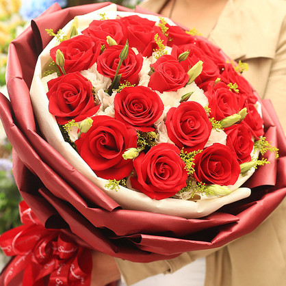 【给你幸福 】19枝卡罗拉红玫瑰,桔梗、黄莺穿插点缀