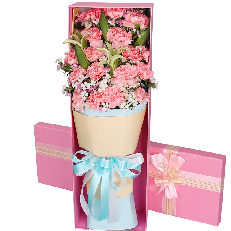 【绽放的祝福】19朵粉色康乃馨玫瑰混搭(8朵粉玫瑰,11朵粉色康乃馨),5支多头粉色香水百合,搭配尤加利叶装饰。