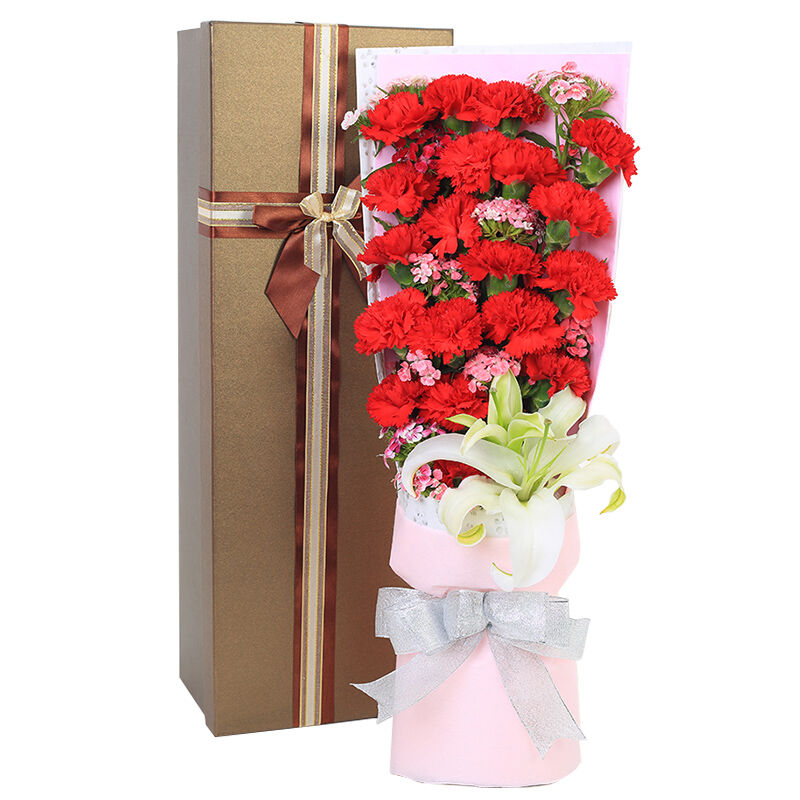 【感恩父母心】19支红色康乃馨+1支多头白百合,搭配石竹梅。
