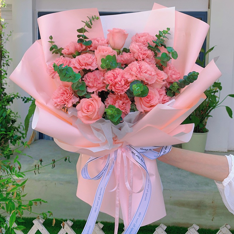 【感恩陪伴】21支粉色康乃馨、粉玫瑰混搭,搭配尤加利叶装饰。