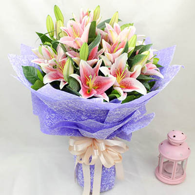 【恰似你的温柔】8枝粉色多头西伯香水百合,搭配绿色新鲜叶材。