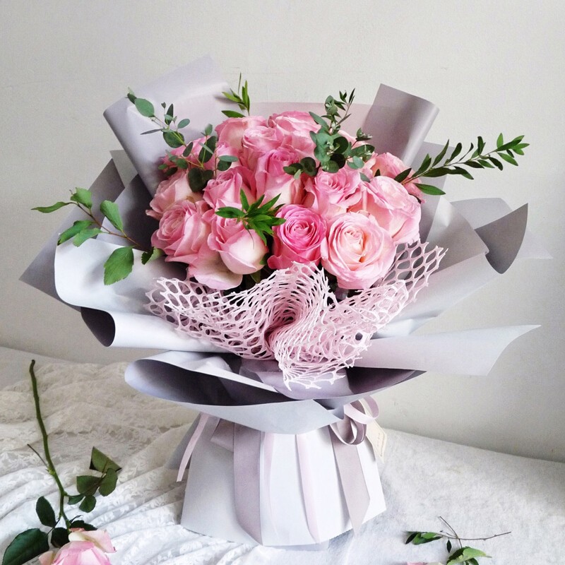 【想见你】19朵精品粉玫瑰,搭配尤加利叶,绿叶装饰。
