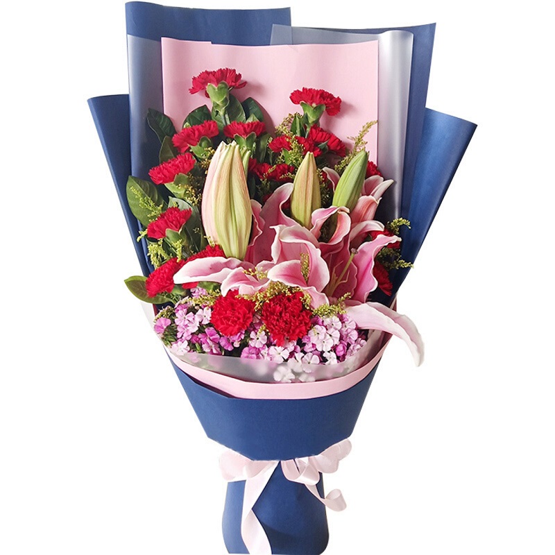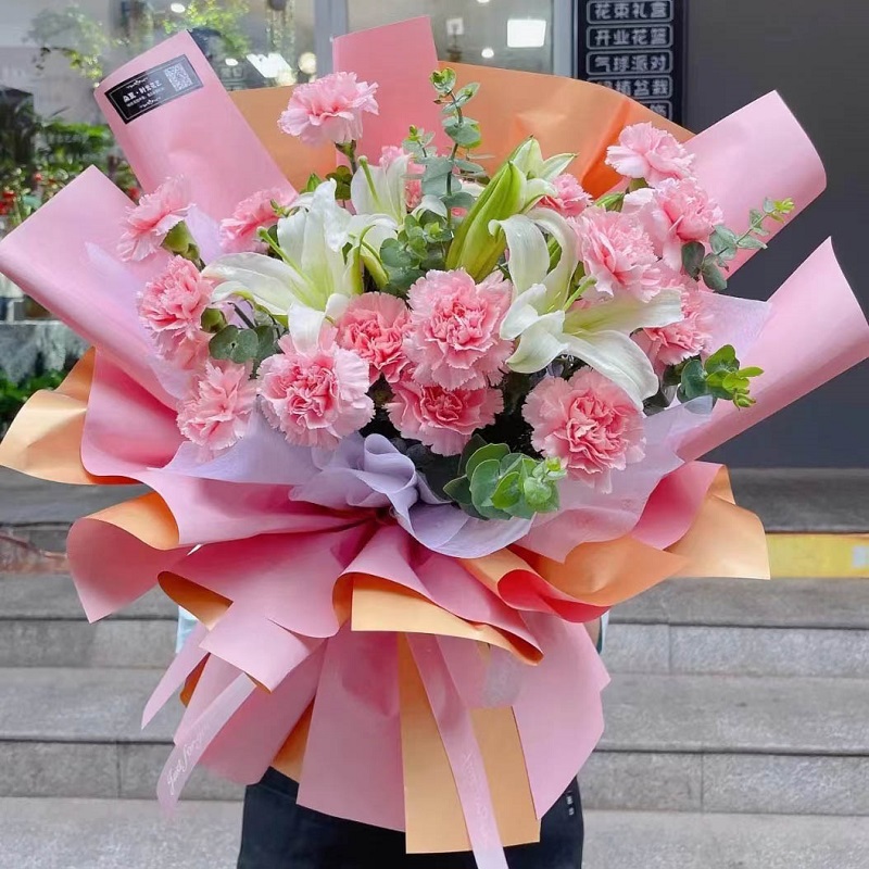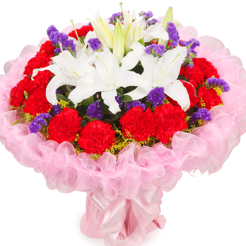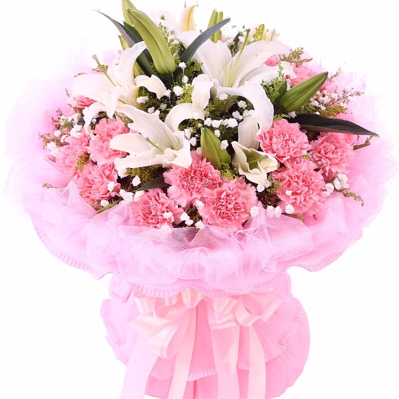 【祝福你】19支粉色康乃馨,3支白色多头香水百合,搭配满天星装饰。