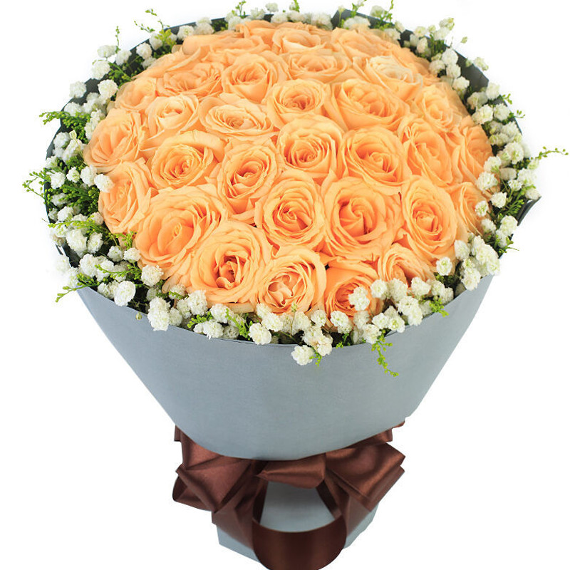 【星火赠你】33支精品香槟玫瑰,外围搭配适量白色满天星、黄莺。