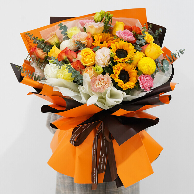 【祝你成功】3朵向日葵,11朵黄色系(香槟色,橙色,金辉)玫瑰混搭,3朵粉色系康乃馨,搭配3支多头橙色小玫瑰,5支洋桔梗,乒乓菊,尤加利叶装饰。